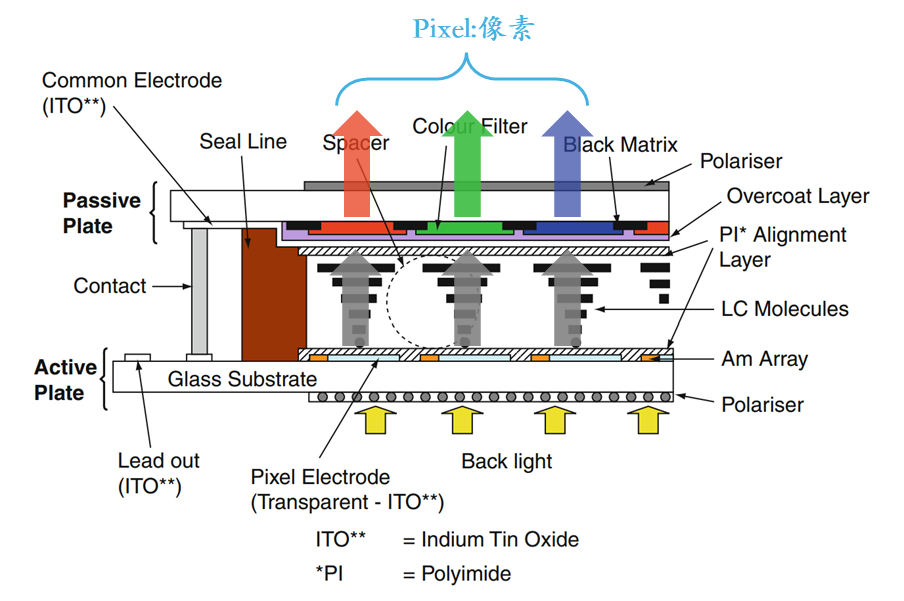 LCD (ຈໍສະແດງຜົນຂອງແຫຼວ), ເປັນການແກ້ໄຂບັນຫາທີ່ເປັນຜູ້ໃຫຍ່ແລະໄດ້ຮັບຮອງເອົາຢ່າງກວ້າງຂວາງທີ່ສຸດ: ສຸດທ້າຍ, ຄວາມສະຫວ່າງຂອງແຕ່ລະ pixel ໄດ້ຖືກປັບໂດຍການຄວບຄຸມການກໍານົດທິດທາງຂອງໂມເລກຸນ Crystal Crystal Crystal. ຂະບວນການນີ້ແມ່ນຂື້ນກັບການປະສານງານຂອງສ່ວນປະກອບຫຼັກ: ຫນ່ວຍສາຍໄຟ, ຫນ່ວຍໄຟ, ຊັ້ນຂາງ, ແລະຕົວກອງສີ.