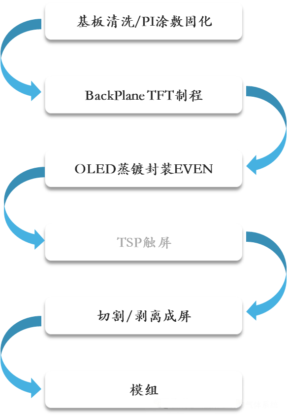 ຂະບວນການຜະລິດຫຼັກຂອງ AMOLED ກ່ຽວຂ້ອງກັບຂະບວນການຫນ່ວຍງານດ້ານວິຊາການດ້ານເຕັກນິກຫຼາຍ. ໃນຂະບວນການທີ່ມີຂະບວນການຂອງໂປແກຼມ Silicon Silicon (LTPS) ທີ່ມີລະດັບຕໍ່າ. ຂະບວນການໂຄງສ້າງທີ່ສູງສຸດຂອງມັນປະກອບມີຂັ້ນຕອນຕ່າງໆເຊັ່ນ: ການຝາກເງິນປ້ອງກັນ, ຊ່ອງທາງການເຊື່ອມຕໍ່ (ELA), ປະຕູໂຂງ, ແລະການປູກຝັງ. ທາດອາຍຜິດພິເສດມີບົດບາດສໍາຄັນໃນການຝາກຮູບເງົາ, ດັດແປງ, ແລະ etchd ໃຊ້ SIECVD / NH₃ເພື່ອຝາກຫນັງ A-Si / Siox; ການຝາກເງິນຊັ້ນສະເຕີໃນຊັ້ນປະລໍາມະນູ (ALD) ຈ້າງແຮງງານ TMA ແລະH₂Oເພື່ອປະກອບເປັນຊັ້ນທີ່ມີຄວາມກົດດັນal₂o3; etching ແຫ້ງບັນລຸການ steching ຄວາມຊັດເຈນຂອງ gases ທີ່ມີຄວາມຊັດເຈນເຊັ່ນ: cf4 / cf6 / cl2, ແລະ CF4