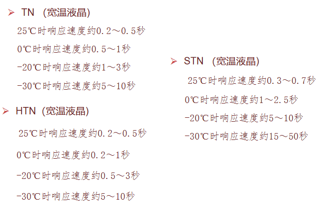 ຄວາມໄວໃນການຕອບໂຕ້, ລວມທັງເວລາທີ່ເພີ່ມຂື້ນ (Tr) ແລະເວລາທີ່ຫຼຸດລົງ (TF), ວັດແທກວິທີການໃຊ້ຈໍ LCD ຕອບສະຫນອງຢ່າງໄວວາ. ຄຸນລັກສະນະທີ່ບໍ່ສະຫຼາດຂອງຜລຶກຂອງແຫຼວກໍານົດອຸນຫະພູມທີ່ແຂງແຮງຂອງພວກເຂົາ: ອຸນຫະພູມຕໍ່າ, ຄວາມເປັນຂອງແຫຼວທີ່ສູງຂື້ນ, ແລະຄວາມໄວໃນການຕອບສະຫນອງທີ່ສູງກວ່າ.